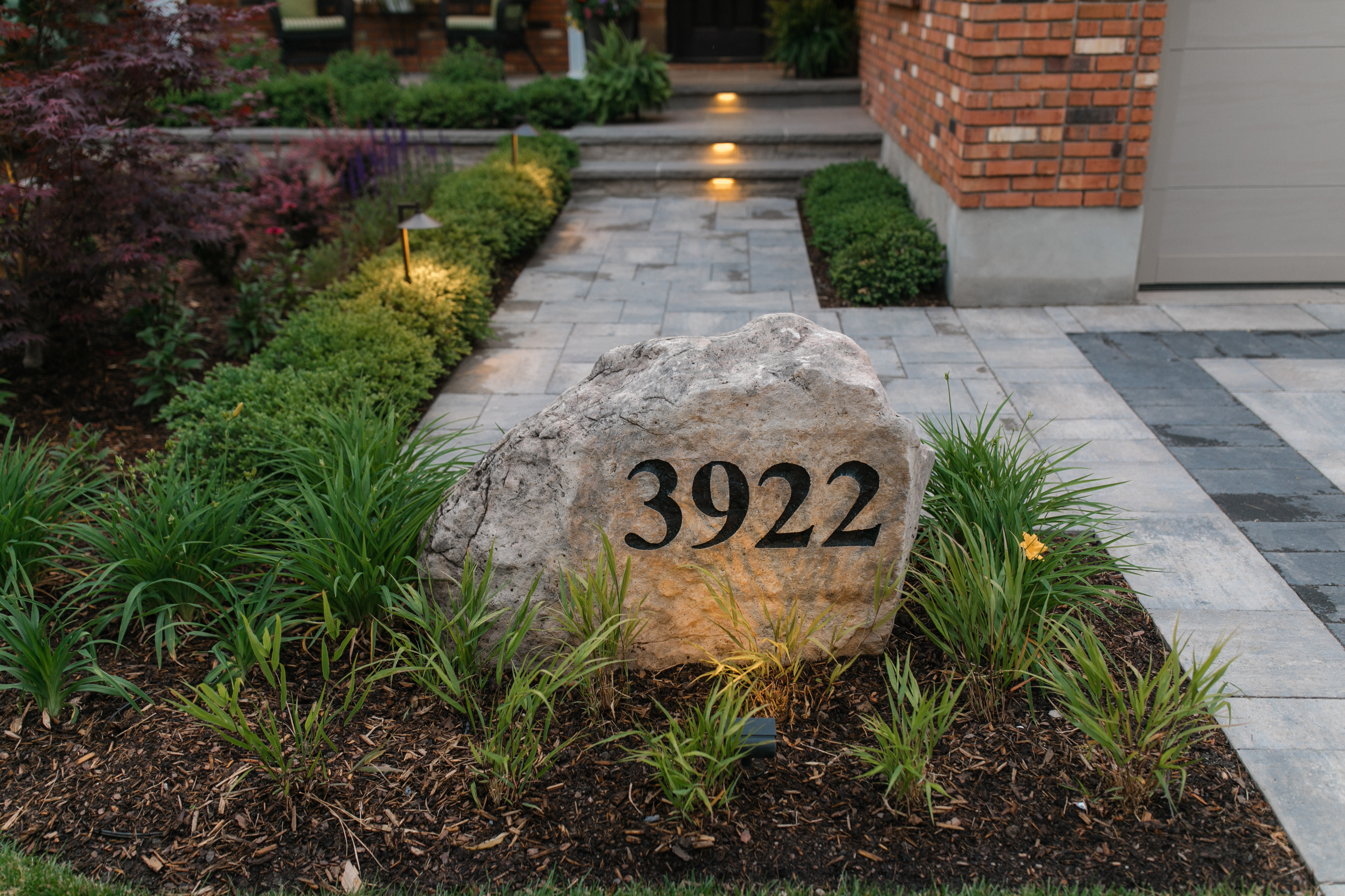 A natural stone address sign was added at the front of the home. The sign is complimented by surrounding plants and landscape lighting.