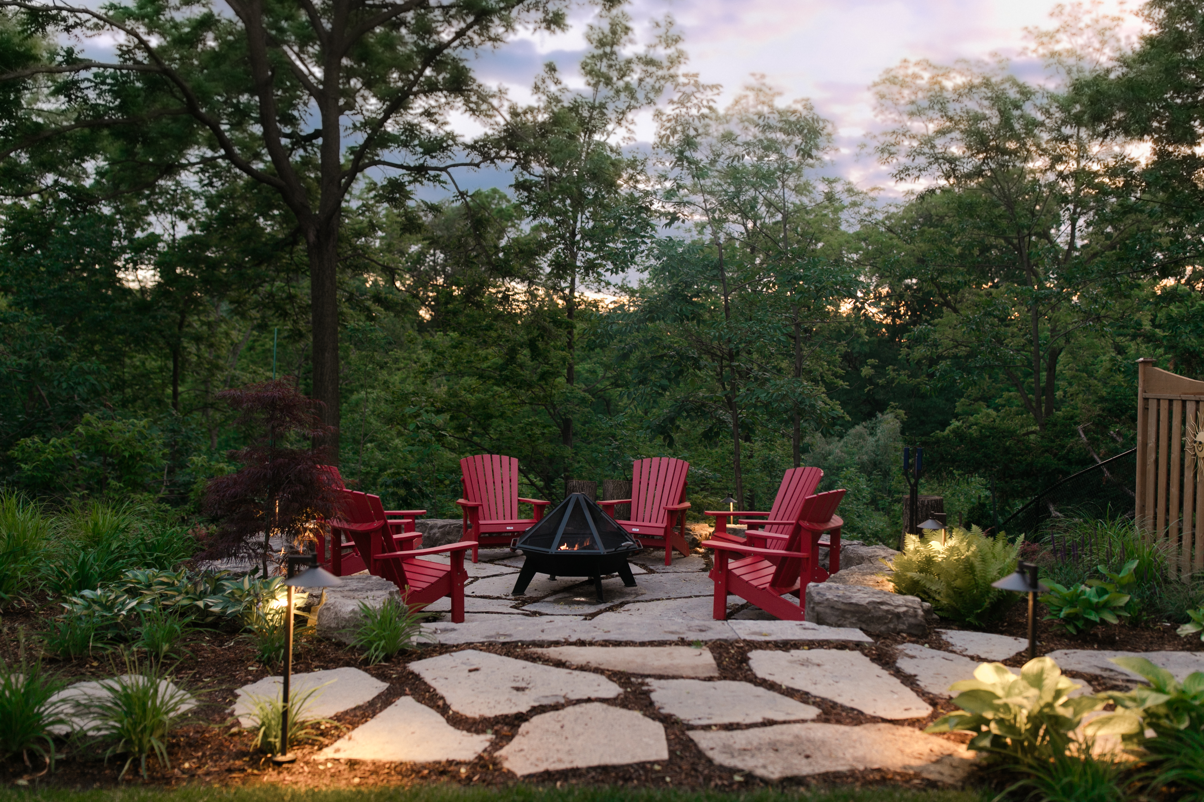 A welcoming firepit is located at the back of the property, surrounded by various plants and landscape lighting. The red Muskoka chairs tie in perfectly with other project features.