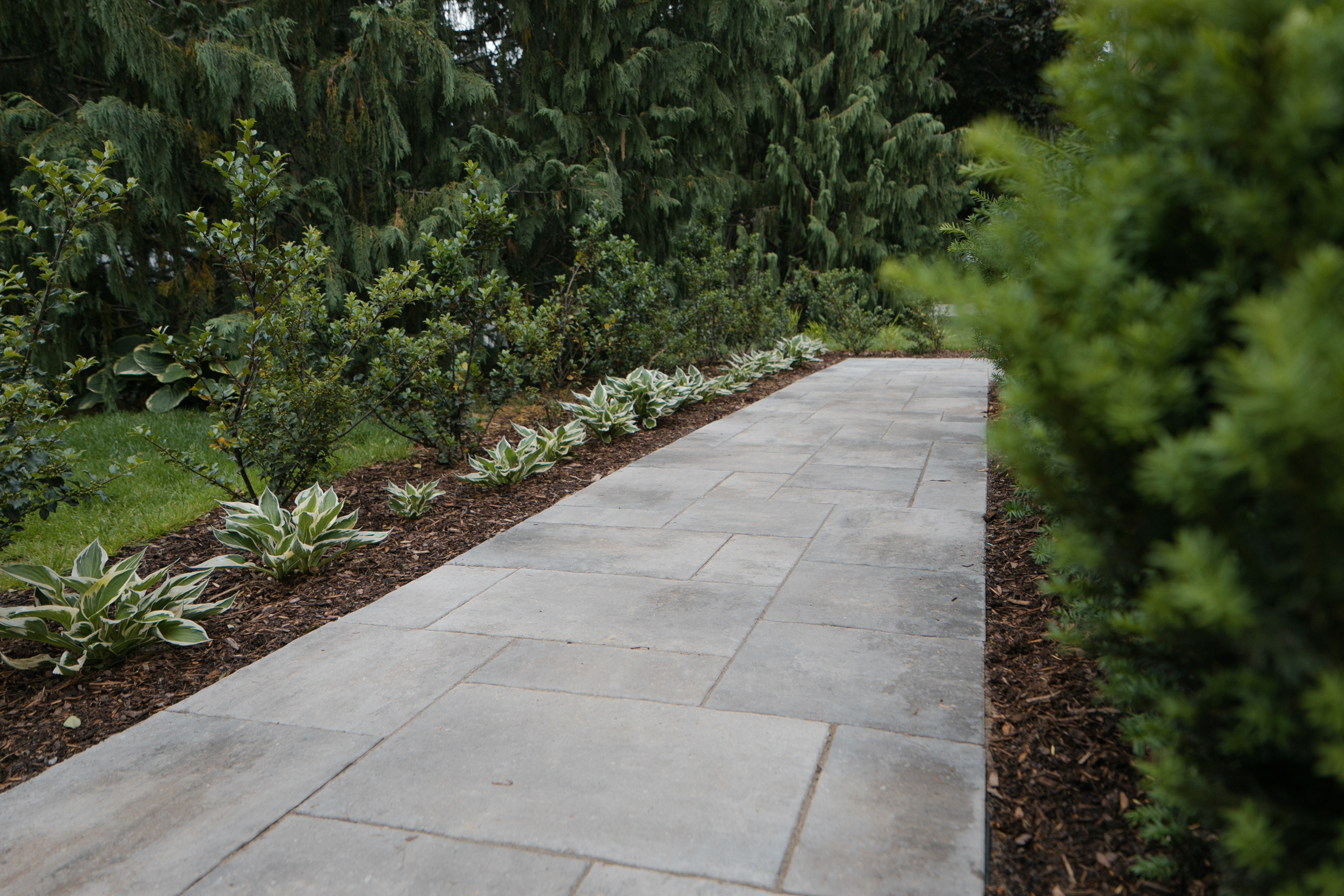 A stone pathway along the side of the house creates flow from the front of the property to the back.