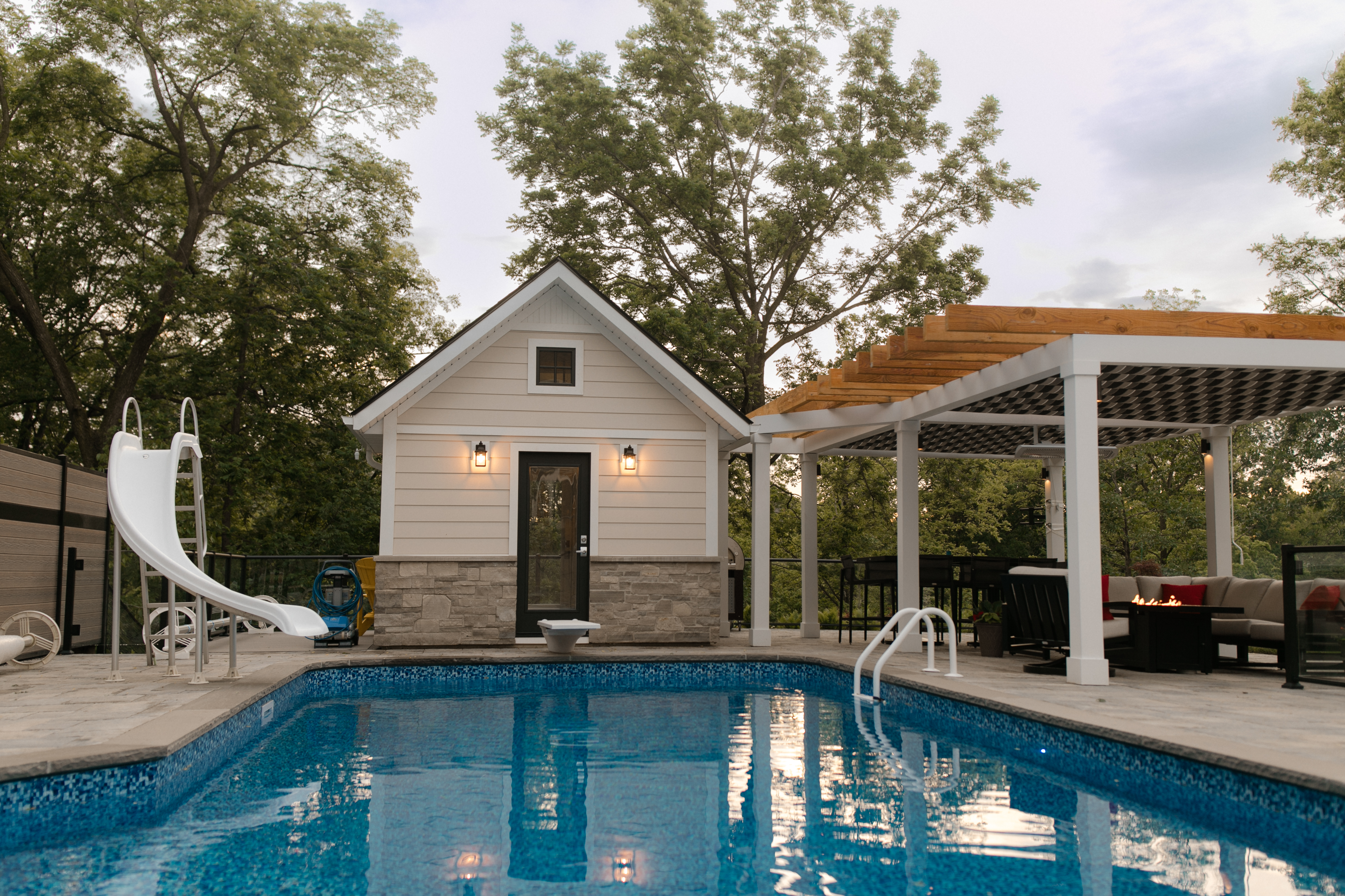 The pool house is one of our favorite project features. It has a large pass-through window on the right side, creating a seamless transition from inside the structure to outside.