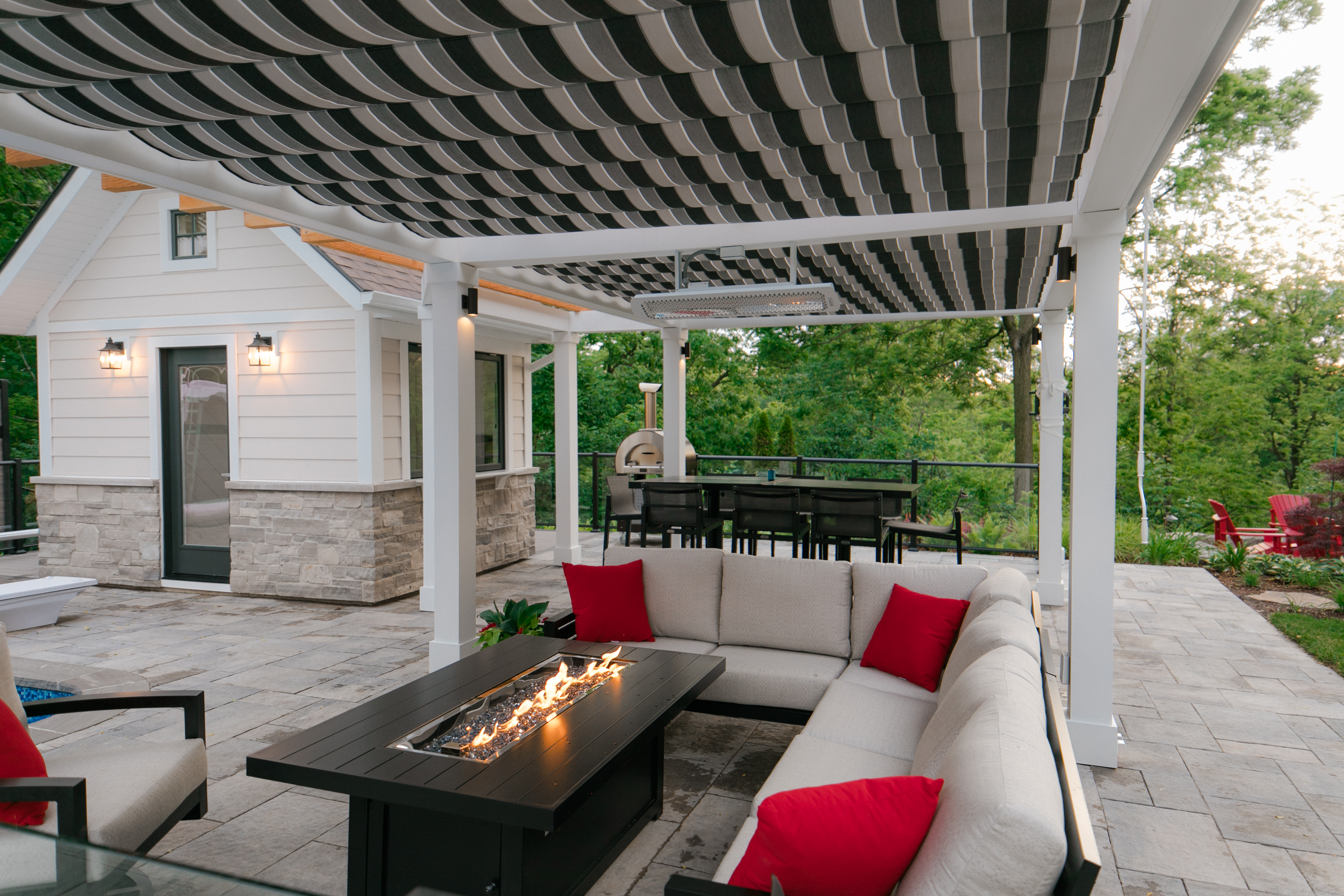Take a look at the spacious patio surrounding the pool and pool structure. A fire table, outdoor seating, a large dining table, and pizza oven make it the perfect space for friends and family to gather together.