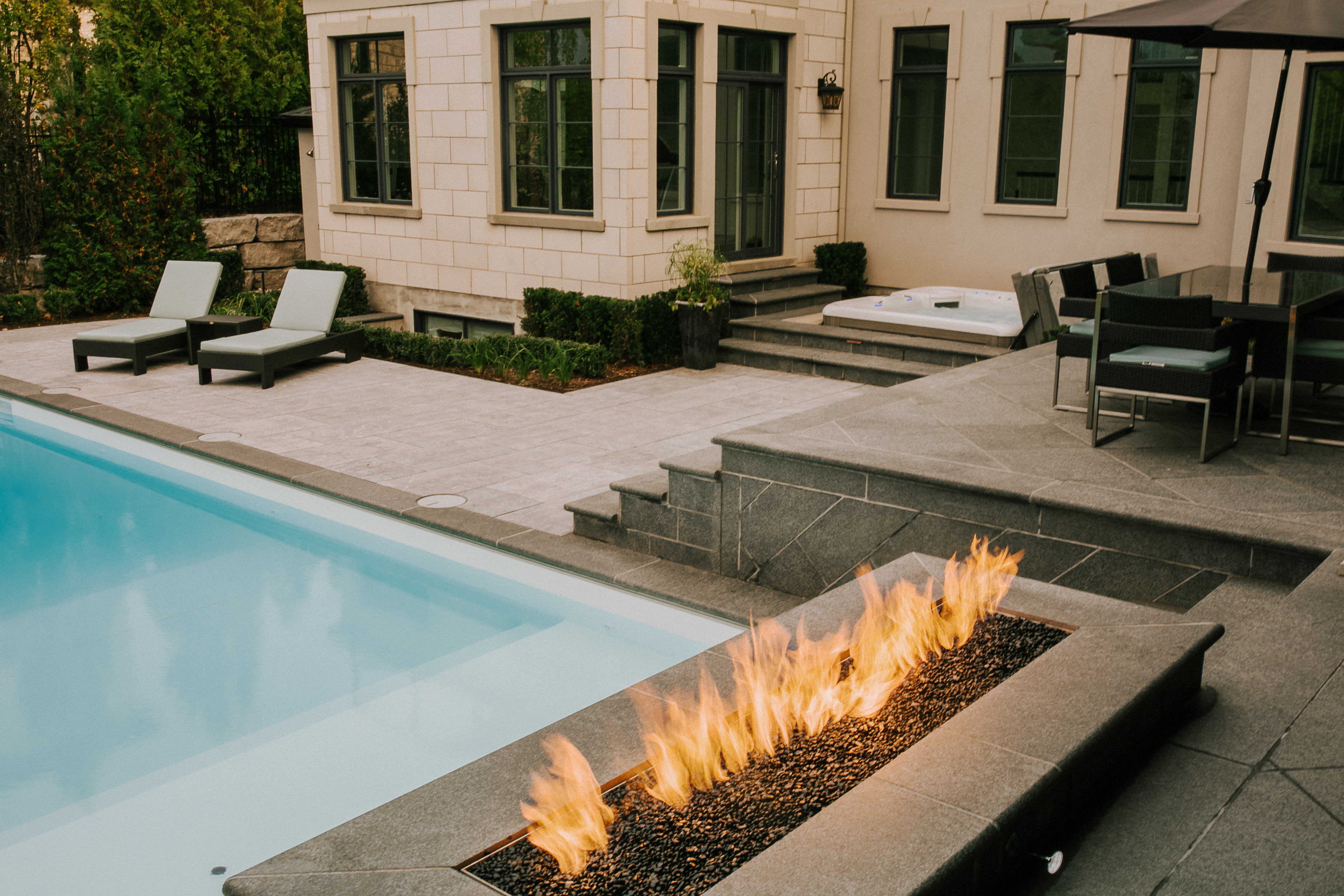 To match the color scheme of the house, we opted for basic textures and tones, keeping the selection to shades of black and grey for the hardscape materials. The cobblestone circle at the front of the home resembles a mosaic, accentuating and directing attention to the home’s entrance. For the porches, pool copings, raised planter and window well copings we used jet black granite flagstone. The pool deck and stepping stones were made of Hampton limestone. The driveway was composed of a combination of limestone Brussels Block and Basalt Courtstone. The property features spruce, cedars, yews, hydrangeas and magnolias, keeping the same theme as the hardscape with very simple colours and shapes.