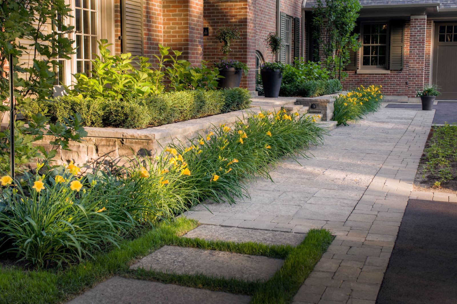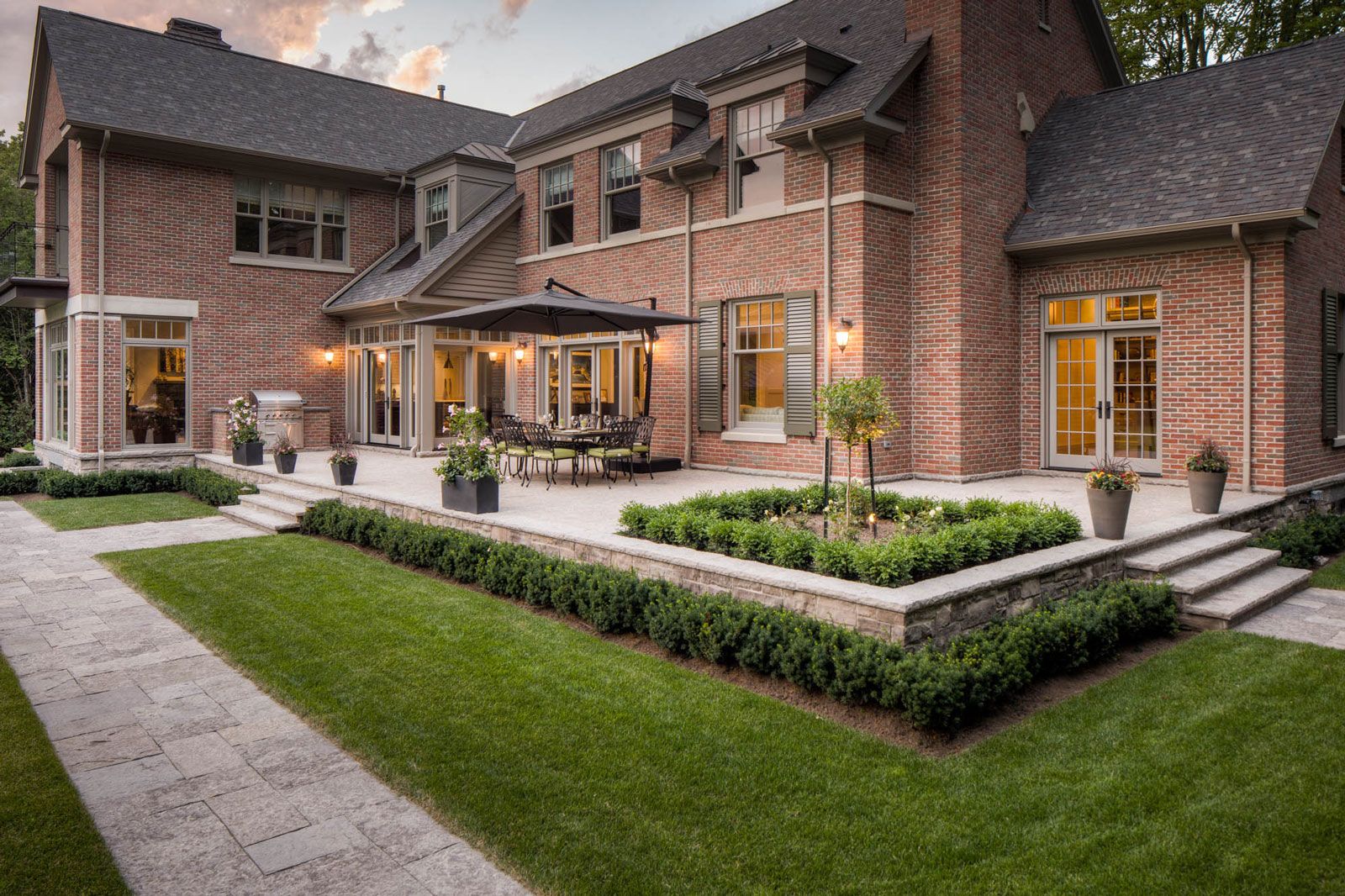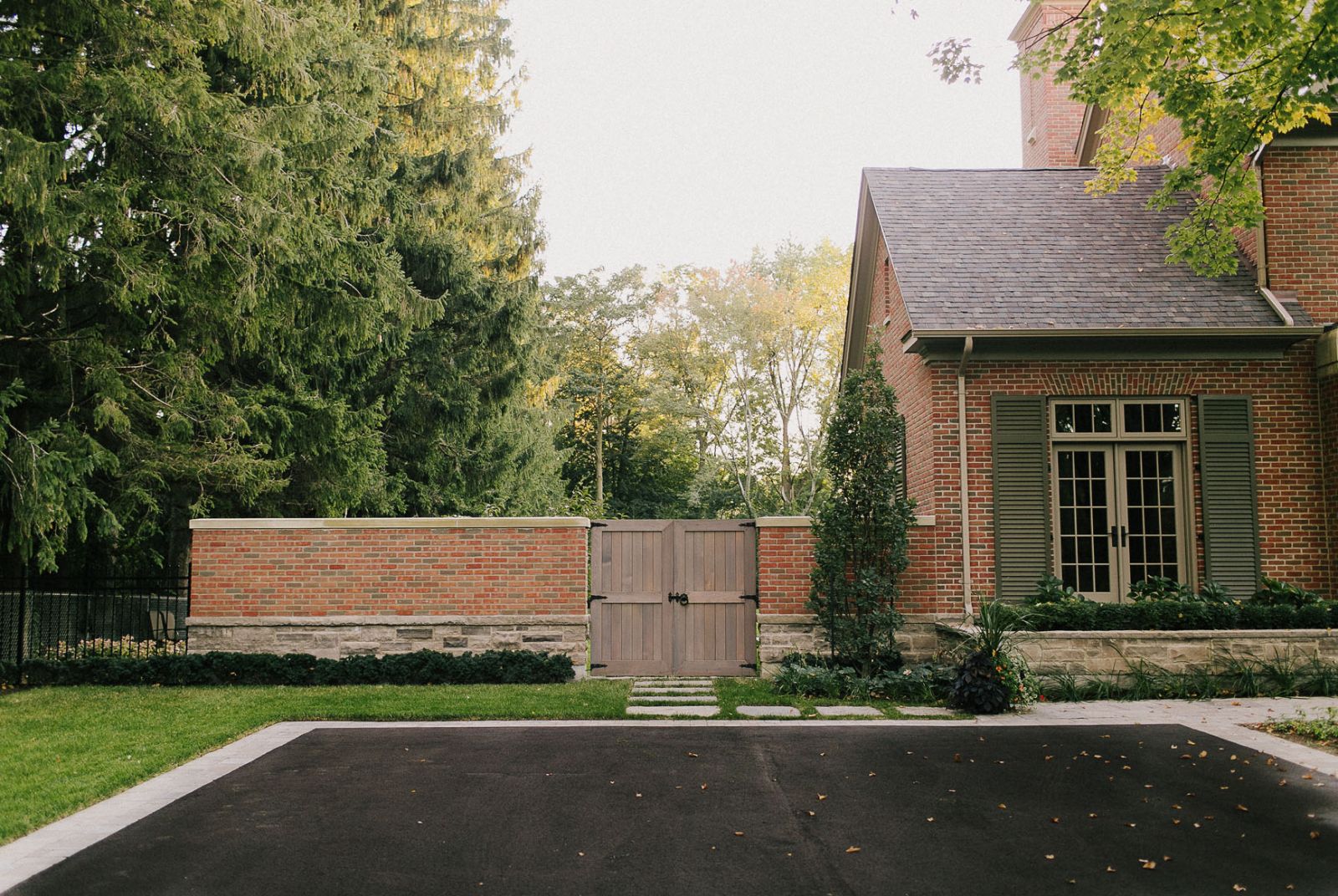 We worked closely with them and selected hardscape materials that tied in with the colours and textures found on the home. For the landscape features, we used the same natural stone that was on the front entrance and back patio. We also created accent walls and masonry features using the same brick, laid in the same pattern. The planting was very minimalist and almost transitional, with very little colour, focused on large specimen pieces spaded in throughout the property.