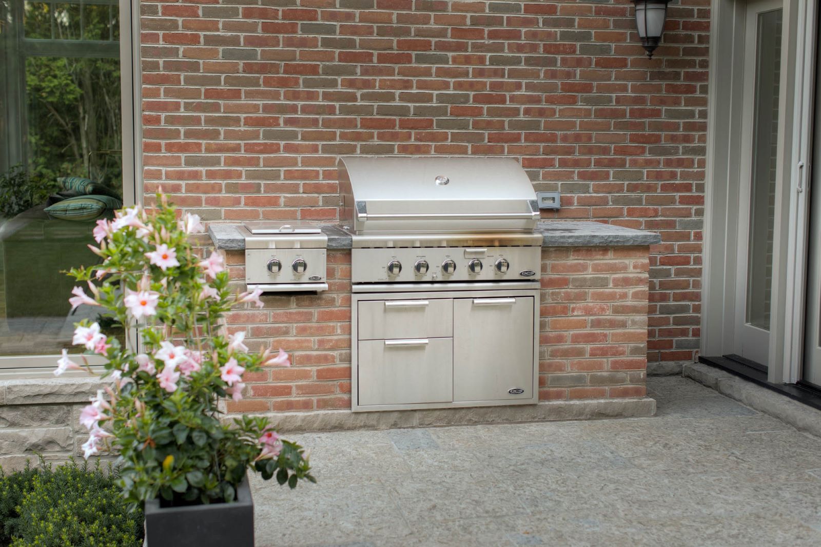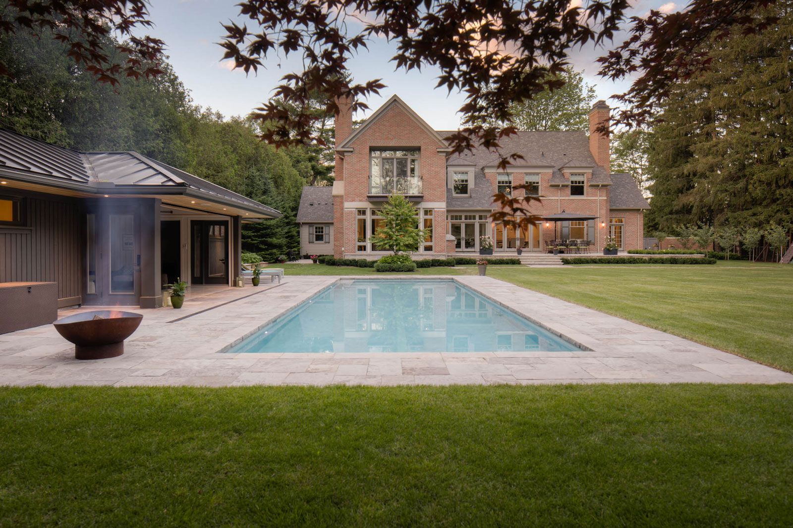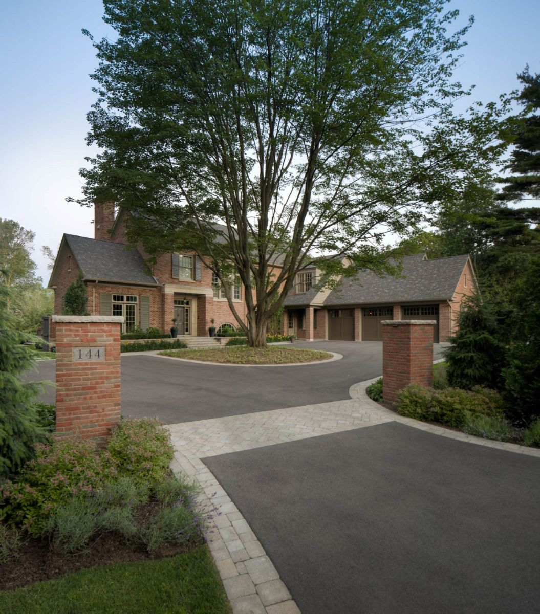 We worked closely with them and selected hardscape materials that tied in with the colours and textures found on the home. For the landscape features, we used the same natural stone that was on the front entrance and back patio. We also created accent walls and masonry features using the same brick, laid in the same pattern. The planting was very minimalist and almost transitional, with very little colour, focused on large specimen pieces spaded in throughout the property.