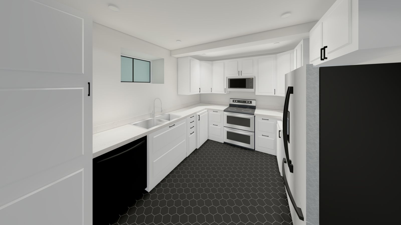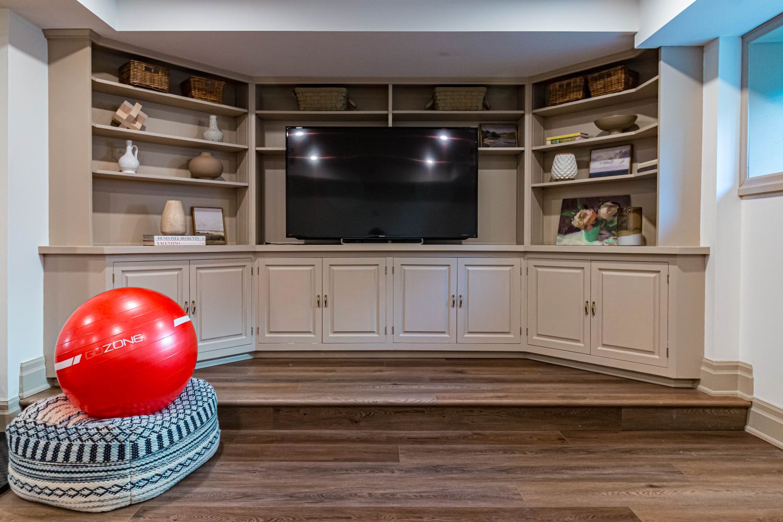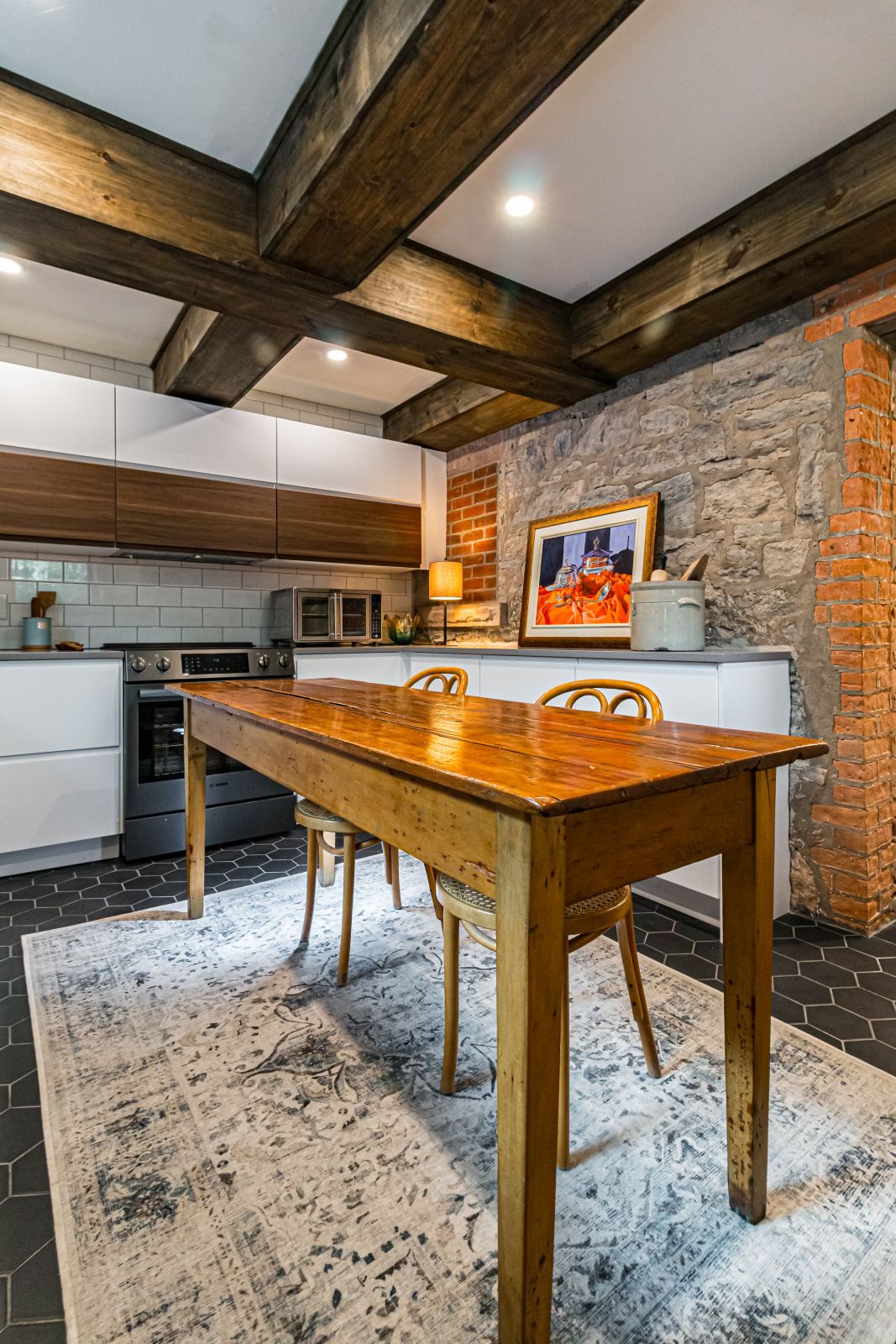 Finally, the basement renovation and sunroom were finished, all while preserving the home's heritage. Here, we designed and built a new kitchen, a full home gym, updated bedroom, and a new storage room. The beautiful tile floors in the basement, new aesthetic wood ceilings, and artistically exposed brick are the perfect final touches.