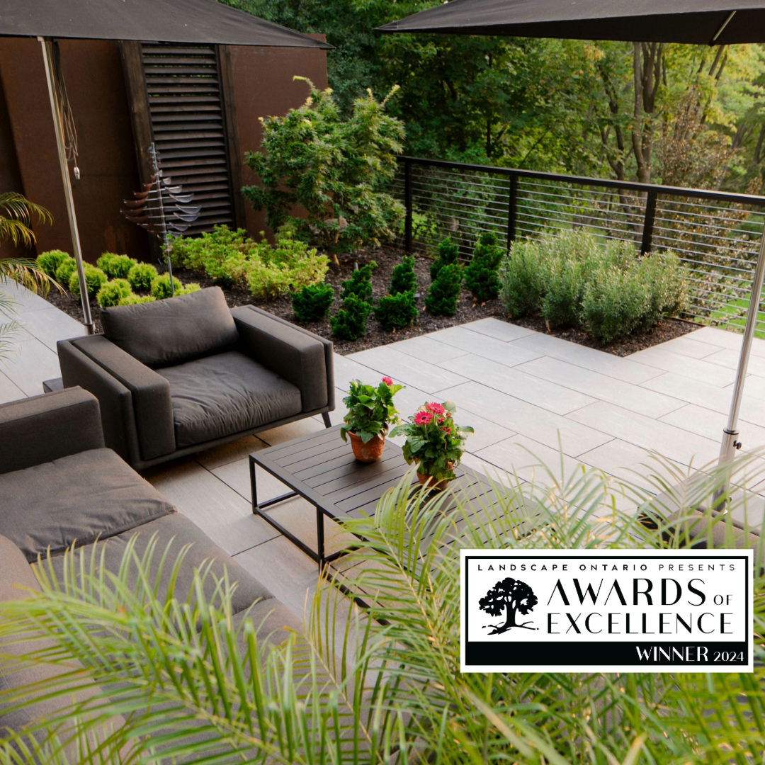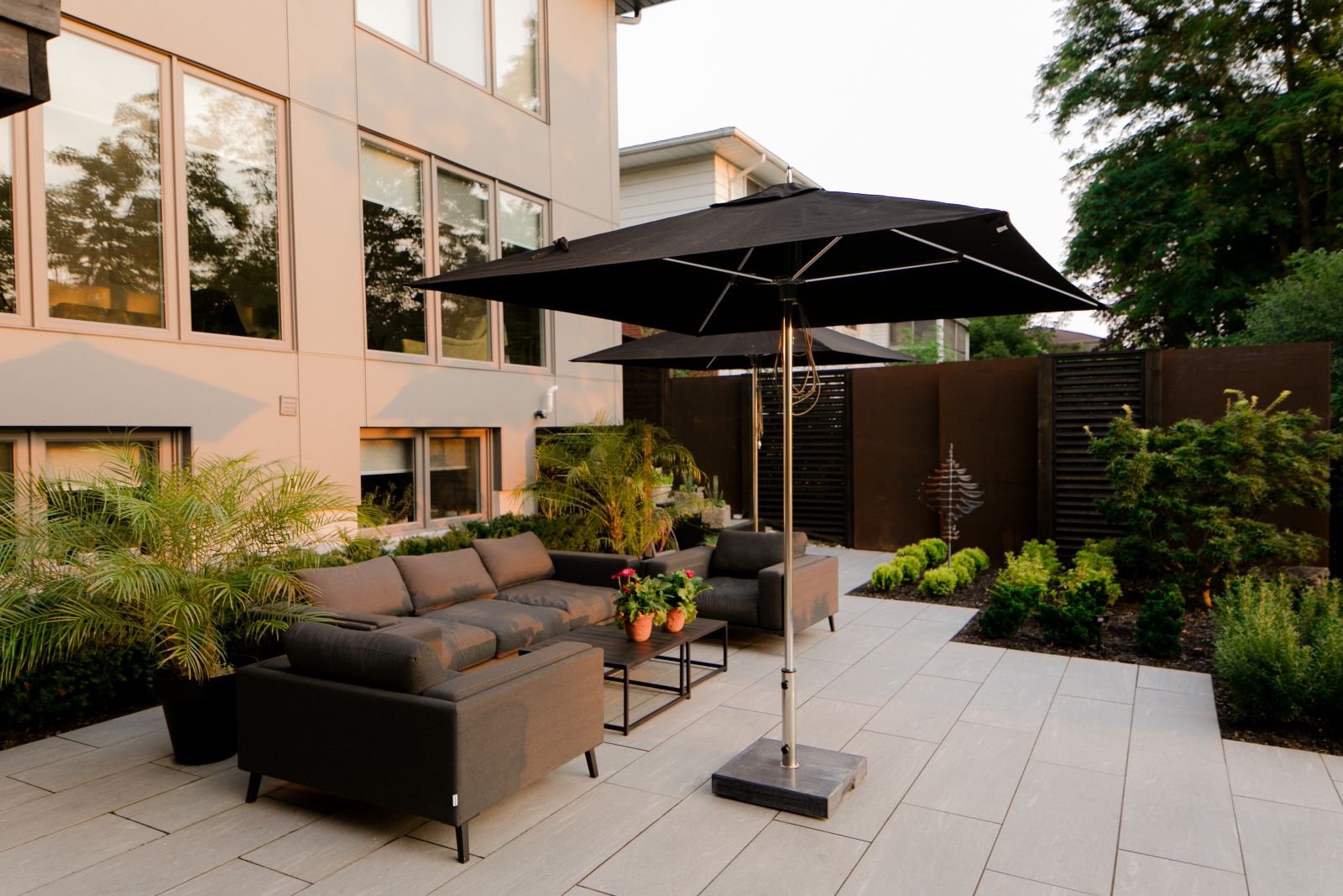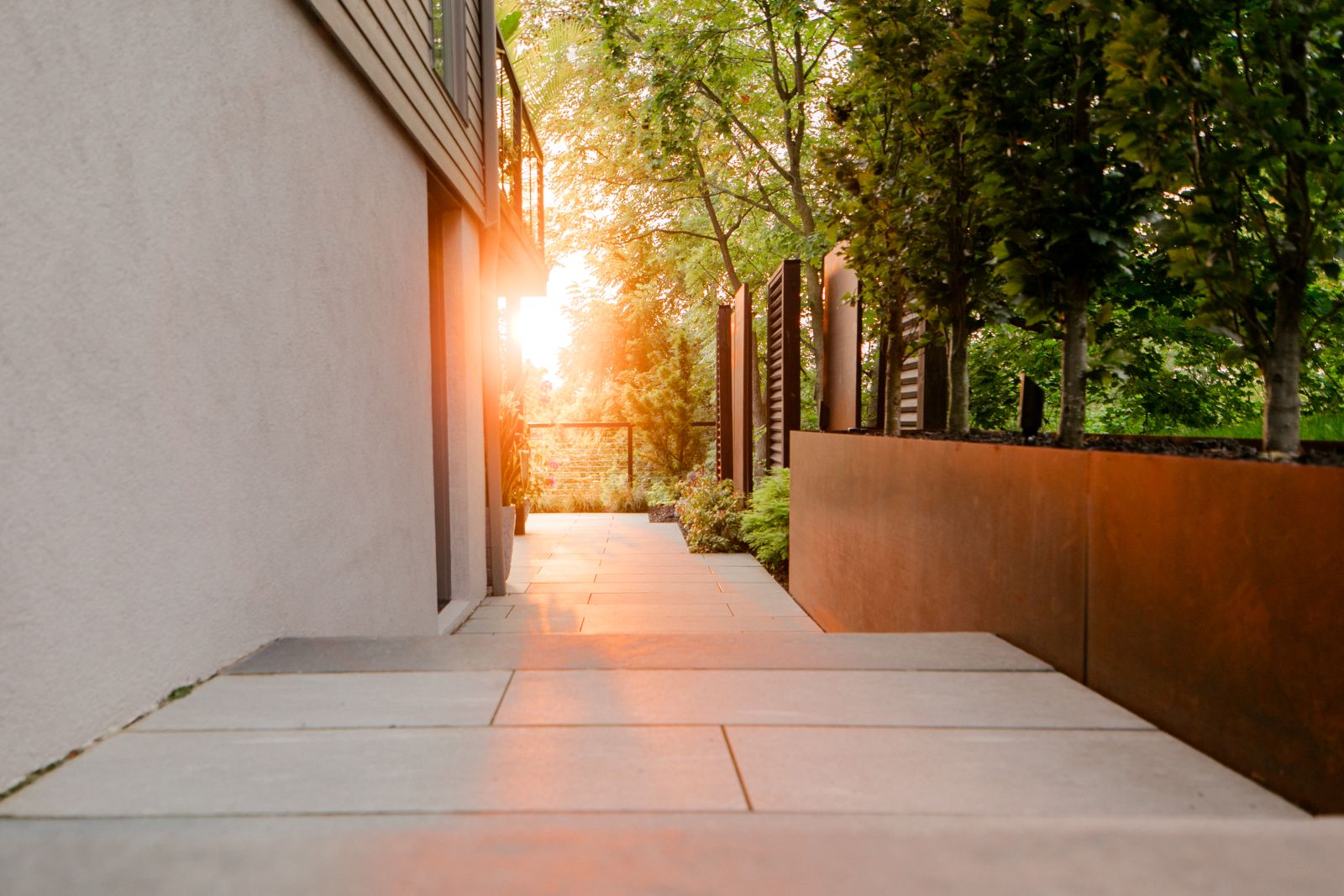 When we arrived at this St. Catharines property, we encountered a sloped backyard featuring a deteriorating timber retaining wall. The backyard lacked a substantial amenity area. Our solution involved the construction of a substantial Corten steel retaining wall, which demanded expert engineering and meticulous execution due to the slope's challenging nature. This newly leveled space served as a canvas for the creation of a porcelain tile patio and the implementation of modern design elements.