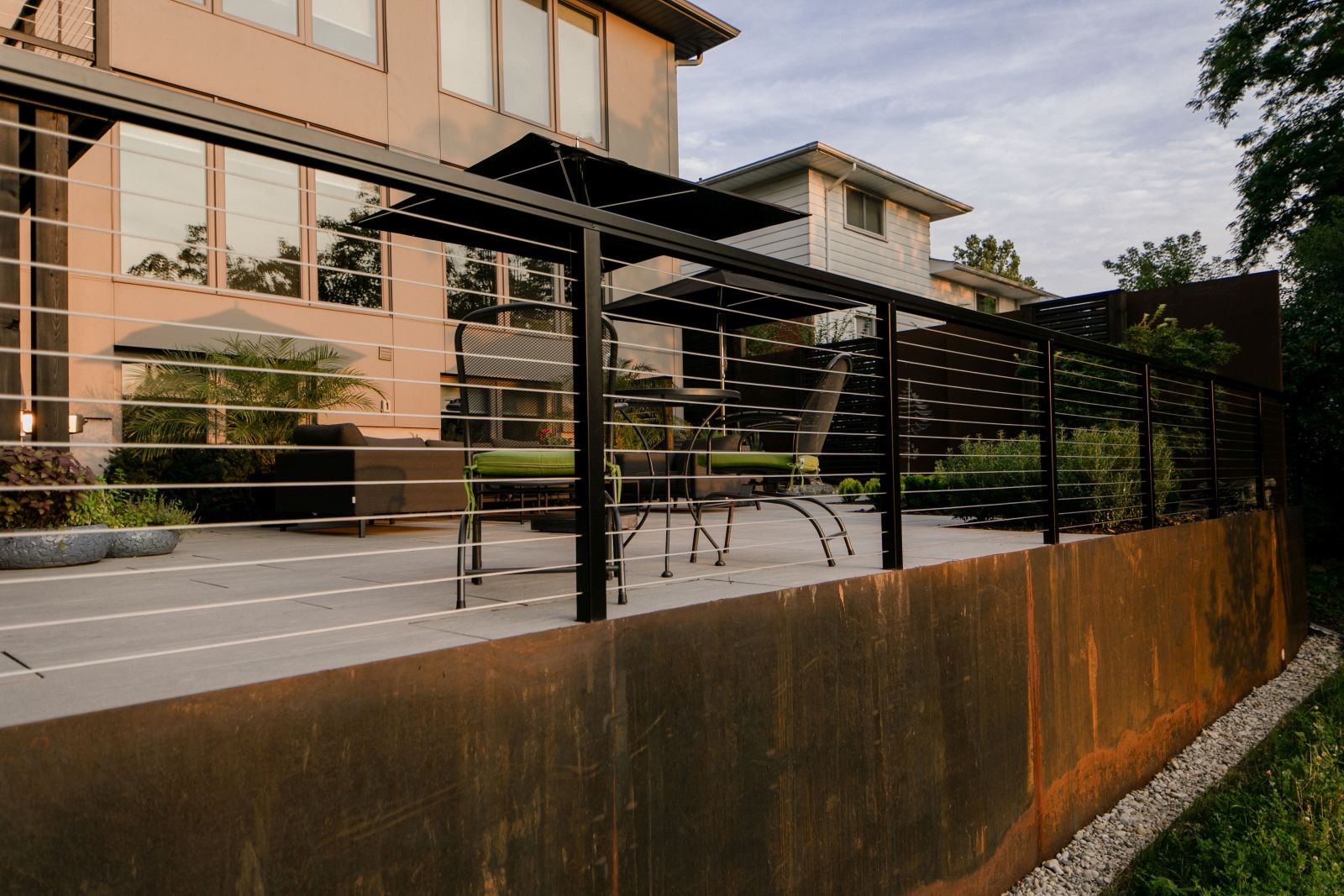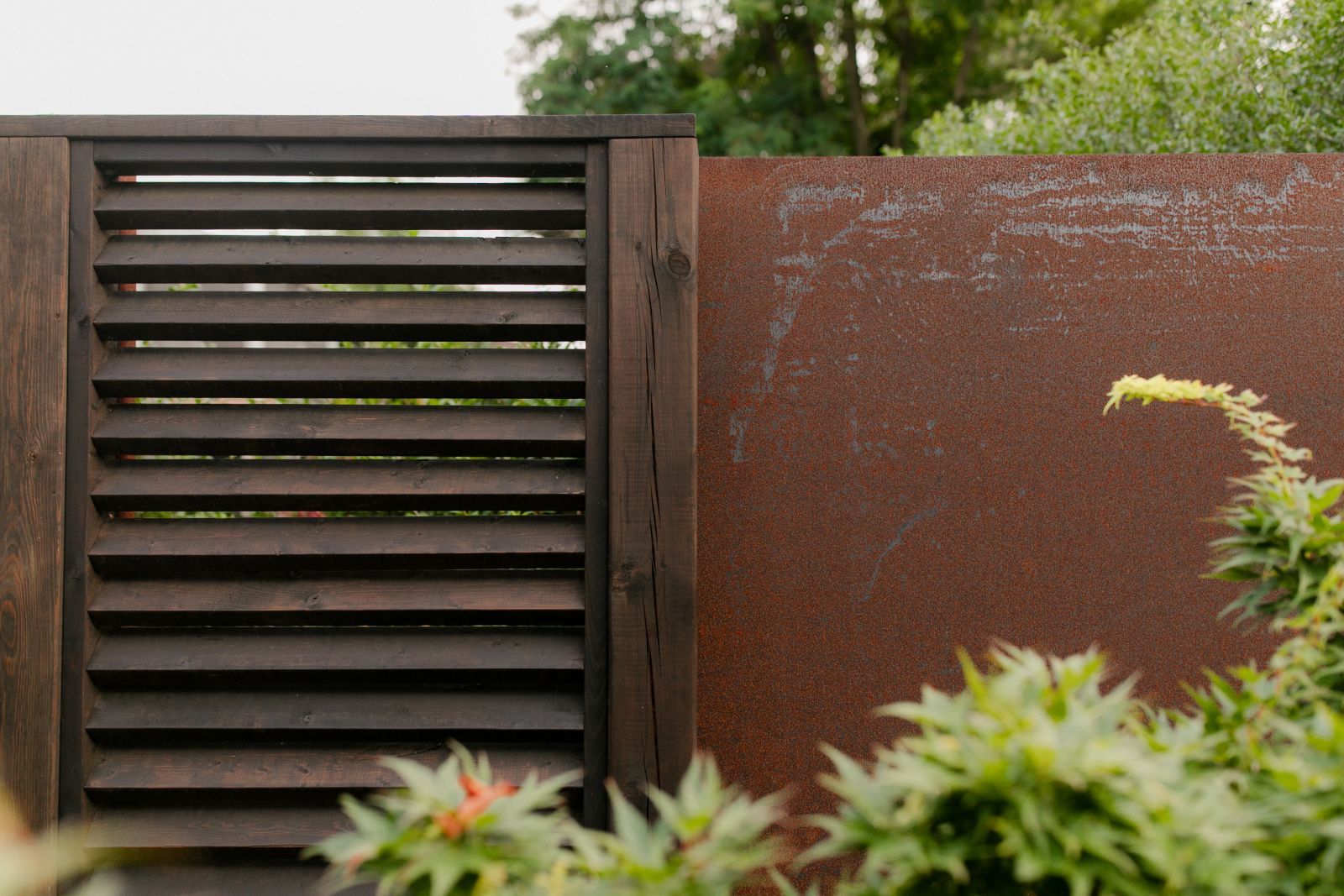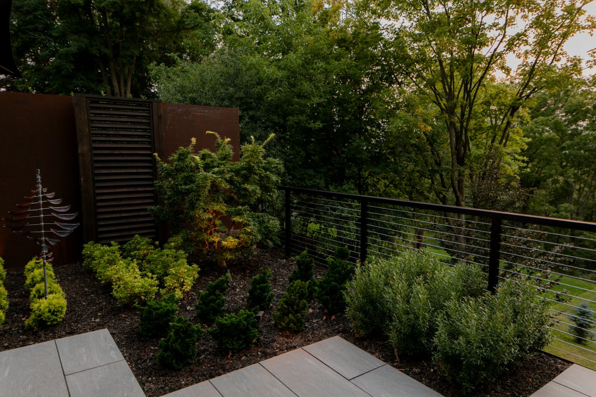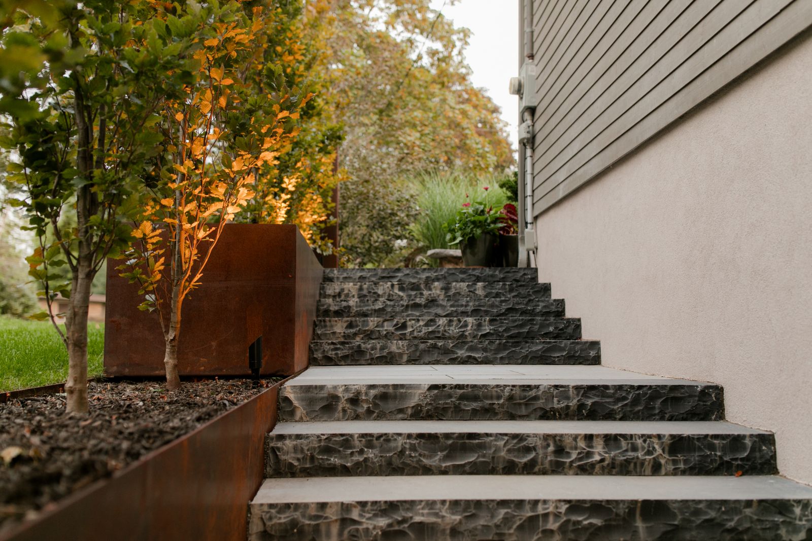 When we arrived at this St. Catharines property, we encountered a sloped backyard featuring a deteriorating timber retaining wall. The backyard lacked a substantial amenity area. Our solution involved the construction of a substantial Corten steel retaining wall, which demanded expert engineering and meticulous execution due to the slope's challenging nature. This newly leveled space served as a canvas for the creation of a porcelain tile patio and the implementation of modern design elements.